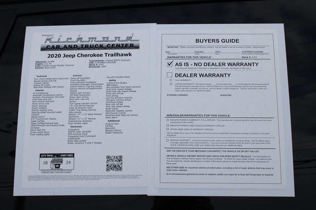 Android Auto, CarPlay, Bluetooth®, Backup Camera, Dealer Inspected, Cherokee Trailhawk, 4D Sport Utility, 3.2L V6, 9-Speed 948TE Automatic, 4WD, Granite Crystal Metallic Clearcoat, Black Cloth, 7 & 4 Pin Wiring Harness, 8.4 Touchscreen Display, Apple CarPlay/Android Auto, Class III Receiver Hitch, Dual Bright Exhaust Tips, Exterior Mirrors w/Supplemental Signals, Four wheel independent suspension, Google Android Auto, Hill Descent Control, Illuminated entry, ParkView Rear Back-Up Camera, Quick Order Package 27E Trailhawk, Remote keyless entry, Stop-Start Multiple VSM System, Trailer Tow Wiring Harness, Wheels: 17 x 7.5 Black Painted Aluminum.